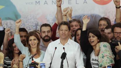 “Nos últimos dias tenho visto muitas pessoas com medo e angustiadas”, afirmou Fernando Haddad na noite deste domingo, durante discurso após a confirmação de sua derrota para Jair Bolsonaro (PSL). “Não tenham medo. Nós estaremos aqui, de mãos dadas. Estaremos juntos. Contem conosco. Coragem, a vida é feita de coragem. Viva o Brasil!”. Com estas palavras de esperança o petista encerrou o pronunciamento para pouco mais de cem militantes emocionados reunidos em um hotel na zona sul de São Paulo. Apesar do tom otimista do presidenciável derrotado, que agradeceu a “todos aqueles que saíram às ruas para panfletar em nome da democracia por todo o país”, os desafios que ele e a legenda irão enfrentar durante os próximos quatro anos são imensos.