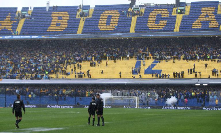 O árbitro chileno Roberto Tobar (à dir.) entendeu que o gramado da Bombonera não oferecia condições de jogo por causa das inúmeras poças d'água acumuladas devido à chuva torrencial em Buenos Aires. Foto: EFE.
