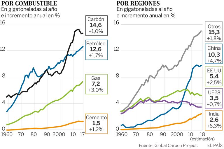 A China é a principal emissora do mundo desde a década passada, com 28% do total de dióxido de carbono do planeta. As projeções para 2018 indicam que suas emissões aumentarão 4,7%. Os EUA, em segundo lugar na lista, registrarão um aumento de 2,5%. Já na UE a previsão é que haja uma diminuição de 0,7%. Na Índia, a última grande potência emissora desse grupo de quatro grandes economias, estima-se um aumento de 6,3% neste ano.