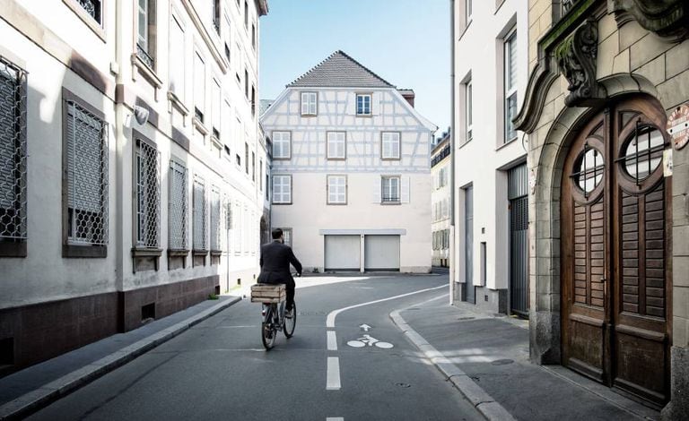 Deve-se chegar a Estrasburgo de trem. E logo depois da vidraça da estação central, parar por um momento diante da visão de centenas de bicicletas amarradas a arcos ou umas às outras. Considerada a capital da União Europeia, é indubitavelmente uma cidade ciclística. Provavelmente a mais comprometida com as duas rodas da França, e a quarta na Europa, de acordo com a classificação elaborada pelo gabinete dinamarquês Copenhagenize em 2015. Na ilha central e em seus arredores, da catedral à pitoresca Petite France, existe uma atmosfera agradável. Os ciclistas conquistaram a cidade na década de 1990, paralelamente à renovação do bonde. Cada um dos canais que a percorrem, cada uma das suas avenidas, tem desde então um espaço reservado para as bicicletas. Até 600 quilômetros em 2017.