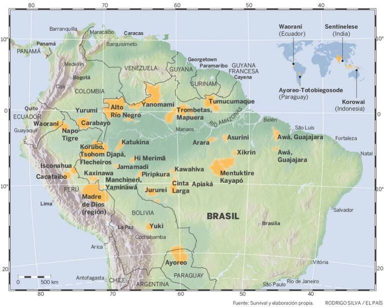 O Peru está em segundo lugar, com cerca de 15 a 20 povos isolados. Watson também destaca casos como o do Paraguai, onde parte do povo ayoreo e outros clãs vivem fora da mata tropical da Amazônia, na região do Chaco. “É um ambiente muito diferente, mas há”, confirma a especialista. Na Bolívia, Equador e Colômbia existem grupos menores, e na parte oeste de Papua Nova Guiné (Oceania) se sabe da existência de vários povos, mesmo não se conseguindo estabelecer o número nem os locais exatos em que habitam.