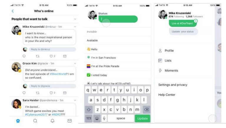 A rede social também planeja testar uma opção para que os usuários possam colocar um status. Esse recurso está disponível em outras plataformas, como WhatsApp e Slack, e lembra os antigos status do Windows Live Messenger. No momento, há quem mude sua descrição para explicar, por exemplo, que vai participar de um certo evento, como a CES. Essa ferramenta pode ser especialmente útil quando os tuiteiros estão nesse tipo de evento ou viajando em um determinado país. Isto é, pode servir para fornecer contexto aos seguidores e informá-los sobre quais tópicos serão tuitados em um determinado período de tempo.