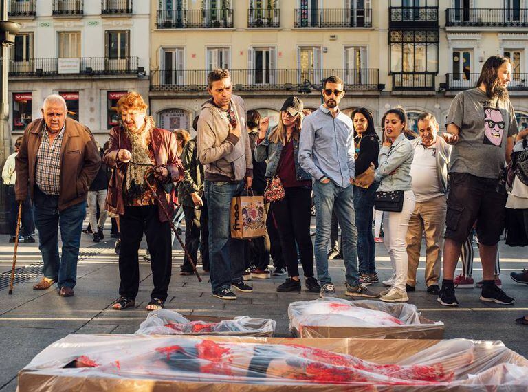 Dias depois, alguns participantes dessa sombria excursão se reúnem em uma praça em Madri. Usam roupas pretas e cobrem seus rostos com máscaras, porque agora representam outro movimento, Anonymous for the Voiceless. Seguram laptops que projetam cenas de sofrimento animal. “A ideia é dizer: ‘Não olhe para o outro lado’”, diz Ricardo. Muitos ativistas pulam de um grupo para outro, dependendo das atividades. Para o chalk challenge (desafio do giz) eles se reúnem sob o guarda-chuva do movimento 269, um número que alguns marcaram a fogo no braço e outros levam pendurado na orelha com uma etiqueta de gado. Desenham ovelhas nas calçadas e escrevem slogans do tipo “não coma seus amigos”. Denunciam o “especismo”, a discriminação de certas espécies de animais. Perguntam: “Por que você ama seu cachorro e come um bezerro?”.