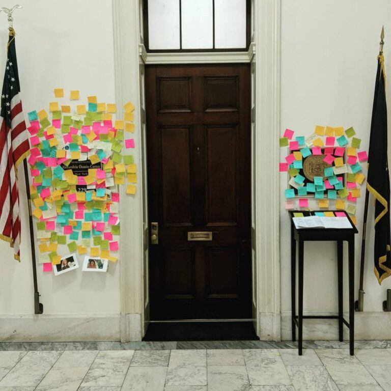 Para a rede conservadora Fox, a jovem já se transformou no grande anátema. Entre os democratas, os mais à esquerda a adoram e os moderados temem seus efeitos. O que todos parecem concordar é que ela não está onde está por acaso. Nessa semana, pelas regras do Congresso, precisou retirar os post-it coloridos de um dos lados da porta. Deixou os do outro. Uma das mensagens, com letra redonda, diz: “Continue lutando. Acreditamos no que você faz”.