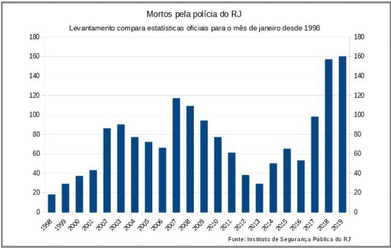 O estado do Rio de Janeiro registrou sua maior letalidade policial em janeiro ao longo de 20 anos com a morte de 160 pessoas no primeiro mês de 2019. Os números oficiais são do ISP (Instituto de Segurança Pública), vinculado ao governo do estado, comandado desde o dia 1º de janeiro desde ano pelo governador Wilson Witzel (PSC), apoiador do presidente Jair Bolsonaro (PSL).