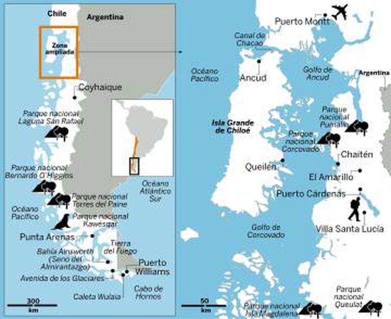 São cerca de 11,5 milhões de hectares protegidos, três vezes o tamanho da Suíça e duas vezes o da Costa Rica. A paisagem imponente e a desconexão —só se encontra sinal em certas áreas urbanas, de tempos em tempos— permitem uma experiência única de contato com o meio ambiente. Há muitas espécies ameaçadas de extinção, como os milenares alerces (cipreste-da-patagônia) do Parque Nacional de Pumalín. Cerca de 140 tipos de aves e 46 de mamíferos. O percurso abrange um terço do país –de Puerto Montt, no norte, até Cabo Horn, no sul–, integrando territórios do fim do mundo em que nunca foi fácil se locomover. A geografia complexa exige o planejamento prévio da viagem, em alguns trajetos é necessário combinar carros e barcaças, e o clima nem sempre é propício (recomendamos viajar entre setembro e maio, evitando o inverno austral).