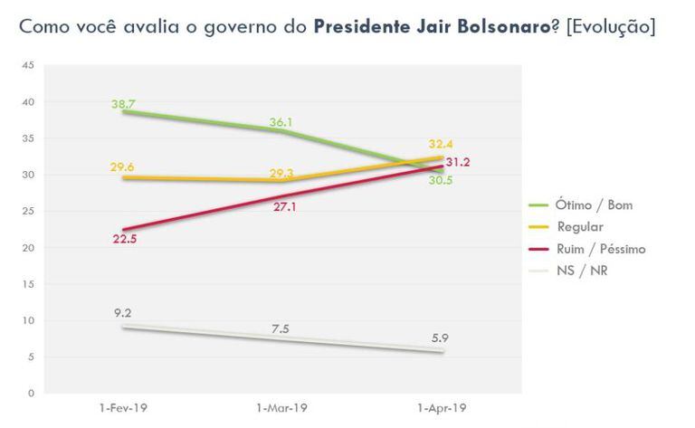 A aprovação do Governo de Jair Bolsonaro (PSL), que completa cem dias na semana que vem, continua em queda. Os números da pesquisa Atlas Político, feita com 2.000 pessoas entre os dias 1 e 2 de abril, indicam que há um triplo empate entre aqueles que acham a gestão ultraconservadora boa/excelente (30,5%), regular (32,4%) e ruim/péssimo (31,2%). Aqueles que aprovam de maneira mais enfática o presidente já estão numericamente atrás daqueles que desaprovam ou acham sua gestão regular. Na pesquisa Atlas Político de fevereiro, o presidente aparecia com 38,7% de ótimo/excelente, 29,6% regular e 22,5% ruim/péssimo. A tendência mudou. Os números atuais também são menos expressivos do que a última pesquisa Ibope, que mostrou Bolsonaro com 34% de ótimo ou bom –mais um termômetro da desidratação, ainda que as cifras não sejam diretamente comparáveis, por causa da diferença das metodologias utilizadas pelos levantamentos.