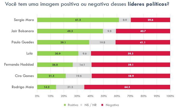 A pesquisa, feita com entrevistados recrutados pela Internet e com dois pontos percentuais na margem de erro, mostra que nem todos foram afetados pelo começo pouco embalado da gestão Bolsonaro. A popularidade do ministro da Justiça Sergio Moro continua não só alta como melhor que a de Bolsonaro e outras lideranças. Em números: 61,5% dos que participaram da pesquisa tem uma imagem positiva do ex-juiz da Operação Lava Jato, enquanto que 49,5% tem imagem positiva de Bolsonaro. "Acredito que a postura de Moro vem sendo mais formal e adequada ao cargo, enquanto que o presidente tem uma postura menos adequada e não entrega as expectativas de mudança imediata que ele criou durante a campanha", explica o cientista político Andrei Roman, diretor do Atlas Político. "Tudo o que Moro vem fazendo ajudou a preservar a imagem dele, como o pacote anticrime", acrescenta. Isso significa que o capital político acumulado por Moro se mantém e que sua figura não é necessariamente atrelada à de Bolsonaro, explica Roman.