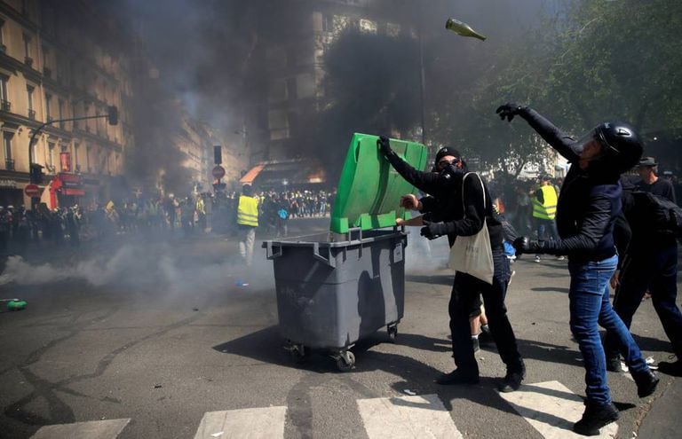 De fato, os primeiros choques com a polícia não demoraram a ocorrer. Dezenas de encapuzados de preto, marca dos militantes radicais conhecidos como black blocs, atiraram pedras contra as forças de ordem. Alguns incendiaram motocicletas e lixeiras nos arredores da praça central, segundo registrou a Reuters. Os agentes empregaram gás lacrimogêneo e granadas aturdidoras para dispersá-los, mas mesmo assim muitos permaneceram na praça e seus arredores horas depois do fim oficial da marcha dos coletes amarelos.