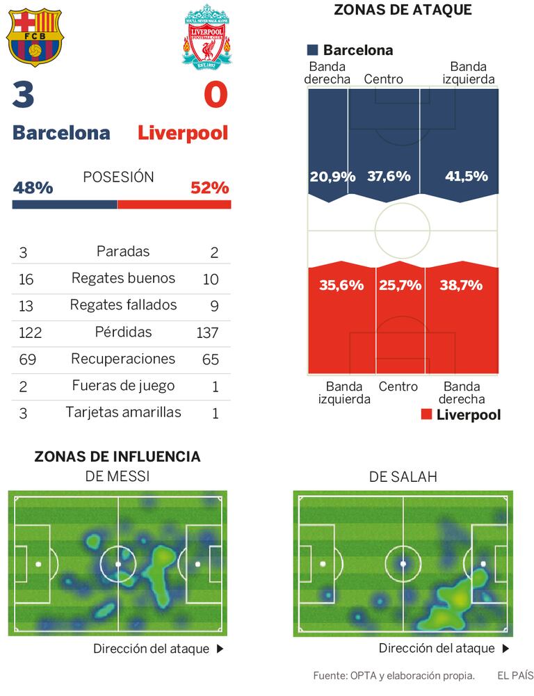 O público comemorou a chegada do intervalo com a mesma satisfação que os jogadores depois de uma partida extenuante e vibrante, muitas vezes descontrolada, pendente das acelerações de Salah e Messi e dos desmarques de Luis Suárez e Mané. Nenhum time havia sido tão exigente com o Barça quanto o Liverpool. Os reds nunca esmoreceram, muito presentes no campo azul-grená, tão vorazes que obrigavam o Barça a se defender com vigor e a contragolpear conduzindo a bola por 50 metros, um desafio devastador para Messi. O futebol do Liverpool era desgastante para uma equipe fisicamente delicada como o Barça.
