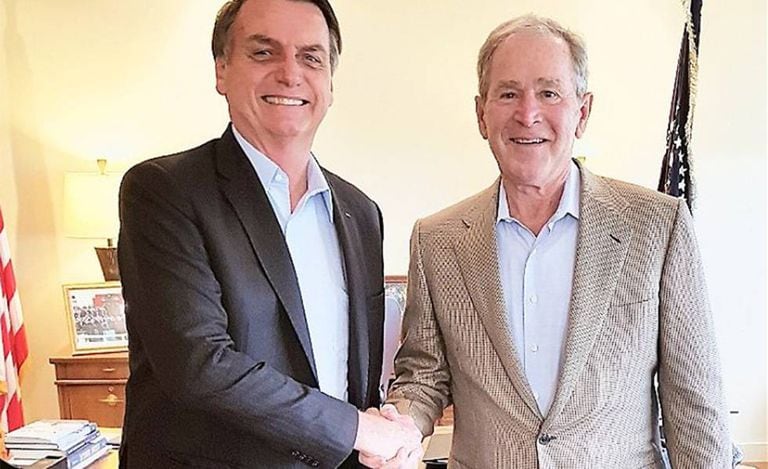 A cerimônia foi transferida para Dallas, onde foi fotografado ao lado de George W. Bush. Bolsonaro foi acompanhado por cinco ministros, incluindo os de Relações Exteriores, Economia e Minas e Energia. Outro objetivo da visita era atrair investimentos, embora esta seja uma tarefa cada vez mais complicada porque as últimas previsões indicam que o crescimento do Brasil será menor do que o esperado quando ele assumiu o poder.