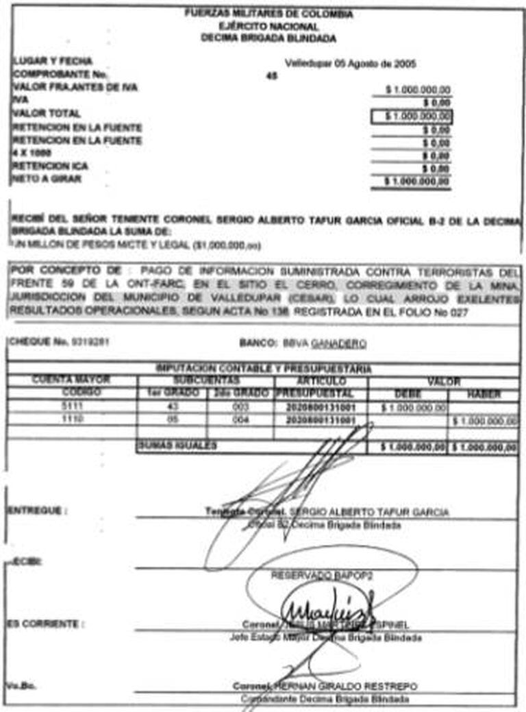 Os documentos entregues a este jornal também mostram que em 5 de agosto de 2005 o atual chefe do Exército assinou uma ordem de recompensa de um milhão de pesos (1,13 milhão de reais, pelo câmbio atual) em troca de informações, o que rendeu "excelentes resultados operacionais e [permitiu] proceder assim contra supostos guerrilheiros". A ordem de entrega também foi assinada pelo então tenente-coronel que comandava o batalhão La Popa, e que hoje é o chefe do Estado-Maior de Planejamento e Políticas. Depois de obter essa informação, dois supostos membros das FARC “deram baixa”, e outro foi capturado. Os documentos do caso indicam que “há sérias dúvidas sobre se os fatos investigados foram gerados com ocasião do serviço ativo” dos militares envolvidos.
