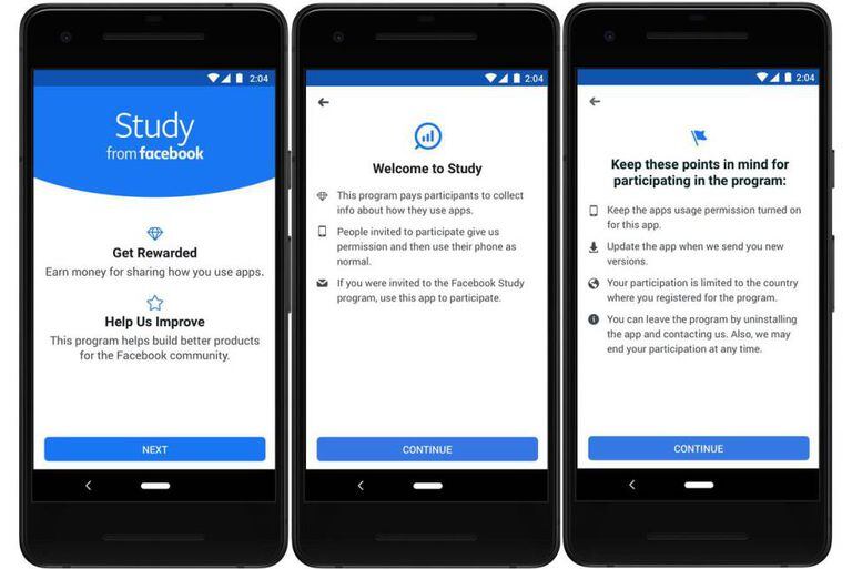 O Study from Facebook é, segundo a empresa, um aplicativo de pesquisa de mercado. Estará disponível primeiro para os usuários de dispositivos Android nos Estados Unidos e na Índia, e depois poderá ser baixado também em outros países. Entre os dados solicitados por esse novo app estão a lista de todos os aplicativos instalados no telefone, o tempo que o usuário os usa e informações sobre o país, o dispositivo e o tipo de rede de acesso. O Facebook garante que não coletará o ID de usuário, senhas e nenhum outro tipo de conteúdo, como fotos, vídeos ou mensagens.