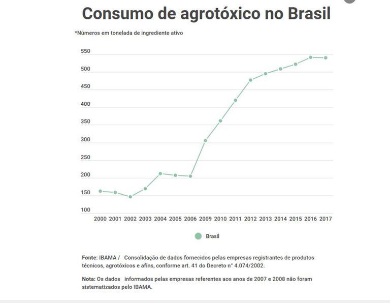 O Instituto Brasileiro do Meio Ambiente e dos Recursos Naturais Renováveis (Ibama) publica desde 2000 boletins anuais de comercialização de agrotóxicos no Brasil. Em 2013, foram 495.700 toneladas de pesticidas vendidos, enquanto em 2017 o número chegou a 539.900 toneladas. O recorde foi registrado em 2016, com 541.800 toneladas vendidas.