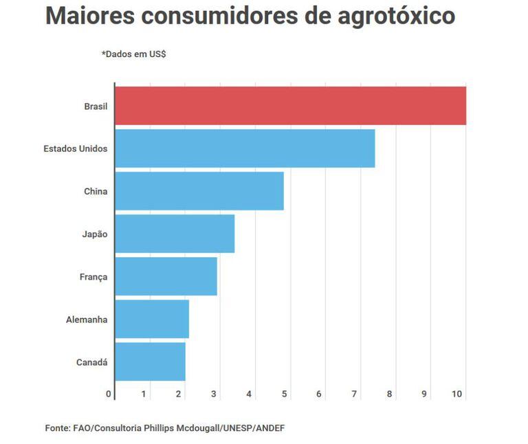 A pesquisa mostra que naquele ano o Brasil foi o país que mais gastou com agrotóxicos no mundo: 10 bilhões de dólares. Estados Unidos, China, Japão e França ficam, respectivamente, nas posições seguintes.