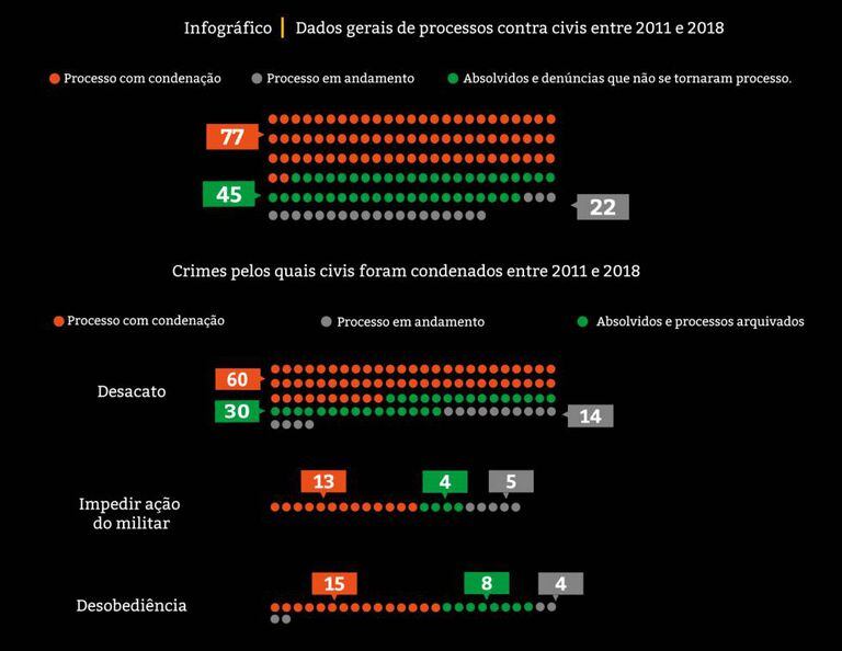 No total, foram 144 processos em que civis são acusados por crimes militares em operações de segurança pública desde 2011, quando ocorreu a primeira grande operação do tipo, no Complexo do Alemão. Desses, 77 foram condenados.