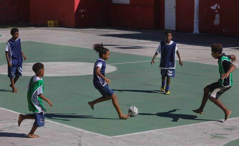 Karen não está sozinha no campinho. É uma das 100 meninas e meninos que integram a escola, um projeto do ativista social Marcos Lelello. Às nove horas o portão é aberto e aparecem os pequenos de oito a 12 anos. "Bom dia", todos dizem. Alguns fecham as mãos e batem os punhos. Estão vestidos com camisas brancas e calças azuis, mas poucos têm tênis. "iniciei este projeto há quase 20 anos para meus filhos, meus sobrinhos e alguns amigos deles. A ideia sempre foi a mesma: afastar, pelo menos por um tempo, as crianças das ruas", conta Lelello. Maria observa como seu filho Gabriel Couto, mais entusiasmado do que talentoso, correr atrás da bola. Ela é a única mãe. "Hoje, por sorte tive um dia de folga e pude vir." "O melhor do projeto", diz Maria, “é que os garotos ficam longe dos bandidos." E acrescenta, com alegria: "E olha quantas meninas! Meu pai não me deixava jogar futebol.”