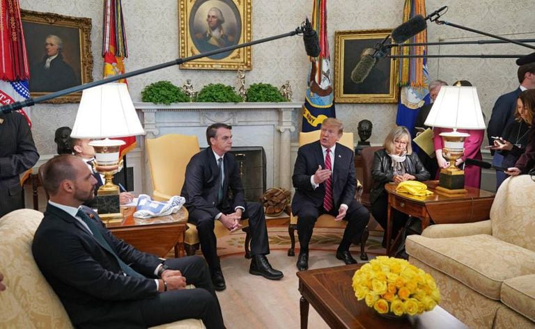 Seria um grande presente de 35º aniversário. O presidente Jair Messias Bolsonaro estuda a possibilidade de nomear seu filho Eduardo, o deputado federal mais votado do Brasil, como embaixador em Washington, a representação diplomática mais apreciada. Eduardo Bolsonaro, que atua extraoficialmente como chanceler, defendeu suas credenciais nesta sexta-feira e respondeu às críticas de nepotismo: “Não sou um filho de deputado (em referência ao presidente) que está do nada vindo a ser alçado a esta condição. Tem muito trabalho sendo feito, sou presidente da Comissão de Relações Exteriores (da Câmara), tenho uma vivência pelo mundo”. O deputado, que estava saindo do Palácio do Itamaraty, sede do ministério e casa materna da sofisticada diplomacia brasileira, acrescentou: “Já fiz intercâmbio, já fritei hambúrguer lá nos EUA, no frio do Maine”, disse.