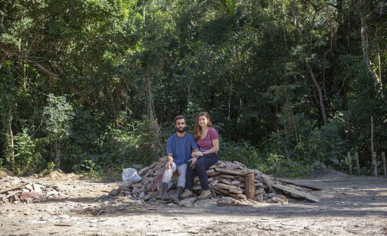 Naquele momento, só Karina e Héber estavam na comunidade. Vanessa e Daiana, esposas de Héber e Marcos, haviam viajado até Matinhos (PR), onde cursam Educação no Campo em um regime de alternância, com temporadas na universidade e na comunidade. As duas têm o plano de construir uma escola naquelas terras para, assim, conseguirem criar os filhos que viessem no futuro. O primeiro passo para isso havia sido dado: a construção das próprias moradias. Mas não demorou para que gestores do Estado, acompanhados da polícia ambiental e de guarda-parques, chegassem até as casas deles. Foram primeiro até a de Héber, uma casa verde construída em uma pequena área que havia sido usada de roça por outros familiares. Depois de uma intensa discussão com os poucos moradores que estavam no local, deram dez minutos para que eles retirassem os pertences antes de começar a demolição da estrutura a marretadas. “A gente ficou meio sem ação. Vieram dois tios ajudar, mas como quatro pessoas vão defender três casas?”, questiona Héber, com os olhos grudados nos entulhos do que sobrou da antiga construção. (Abaixo, Héber Prado e Vanessa Honorato, sentados sobre os entulhos do que era sua casa. Por Maurício Pisani)