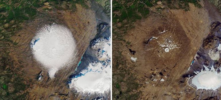 Contudo, o desaparecimento de Ok não era imprevisível. A geleira já vinha declinando ao longo do século XX. Em um mapa de 1901, ela se estendia por uma área de 38 quilômetros quadrados, que em 1978 já era de apenas três. Uma imagem de satélite de 1986 ainda o mostrava como uma imponente mancha branca em forma de cúpula, localizada ao norte de uma cratera repleta de neve. Hoje, mal chega a ocupar um quilômetro quadrado, como mostram as imagens capturadas pela NASA em 1º de agosto. O funeral científico de Ok pode ser o primeiro de 400, a quantidade de glaciares presentes no país nórdico.