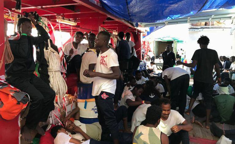 Também disse que durante os 14 dias que o navio ficou em alto-mar, muitos tiveram de dormir amontoados no centro da ponte do navio para não se molhar durante o temporal. Agora, em frente a Lampedusa, acontece mais ou menos a mesma coisa, mas pelo sol de Justiça que aquece o navio, enquanto os imigrantes a bordo esperam notícias com incerteza e não entendem por que, apesar da oferta de seis países europeus, “não houve nenhuma movimentação”.