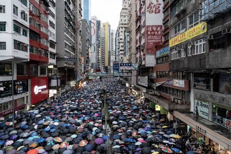 Sob chuva torrencial, um mosaico multicolorido de guarda-chuvas cobriu as ruas adjacentes ao Parque Victoria. Ali várias centenas de milhares de pessoas se reuniram na tarde deste domingo para continuar com os protestos antigovernamentais que abalam Hong Kong há onze semanas. De acordo com os organizadores, a Frente Civil dos Direitos Humanos, o número de participantes chegou a 1,7 milhão de pessoas, uma das maiores manifestações da história da ex-colônia de 7,4 milhões de habitantes. As autoridades haviam negado permissão à marcha de protesto, o que iria atravessar a cidade, reduzindo-o a uma concentração dentro do parque, mas o número de participantes foi tamanho que as áreas ao redor ficaram bloqueadas e as pessoas acabaram se movimentando.