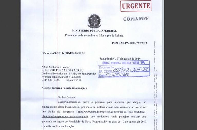 A troca de documentos entre as instituições que revela os antecedentes do "dia do fogo" começa com uma comunicação do procurador Paulo de Tarso Moreira Oliveira, que diz ter sabido dos planos de promover um dia especial para queimadas por um jornal da região de Novo Progresso, no Pará. O ofício foi enviado em 7 de agosto, mas só no dia 12, dois dias depois de os grupos levarem a cabo o plano das queimadas, a resposta do Ibama veio. "Pode-se constatar, diante de tal cenário, grave negligência do Estado na proteção da floresta amazônica, o que abre larga margem para ações desenfreadas por infratores contra o meio ambiente", escreveu o procurador em 22 de agosto, em ofício em que cobrou informações a respeito da Força Nacional e da PM do Pará.