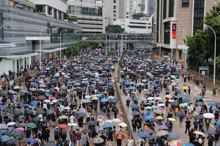Na hora em que a manifestação original havia sido convocada, dezenas de milhares de pessoas marcharam pelo trajeto previsto. Jovens, idosos, famílias inteiras. Uma maré de camisetas pretas, a cor dos protestos, cortou as principais avenidas aos gritos de “Honcongueses, coragem!”, “Levantemo-nos por Hong Kong!”. Um helicóptero sobrevoou a cena, entre exortações dos manifestantes —“cubram-se com os guarda-chuvas para não serem vistos!”— e mais de um dedo médio levantado em sinal de desafio.