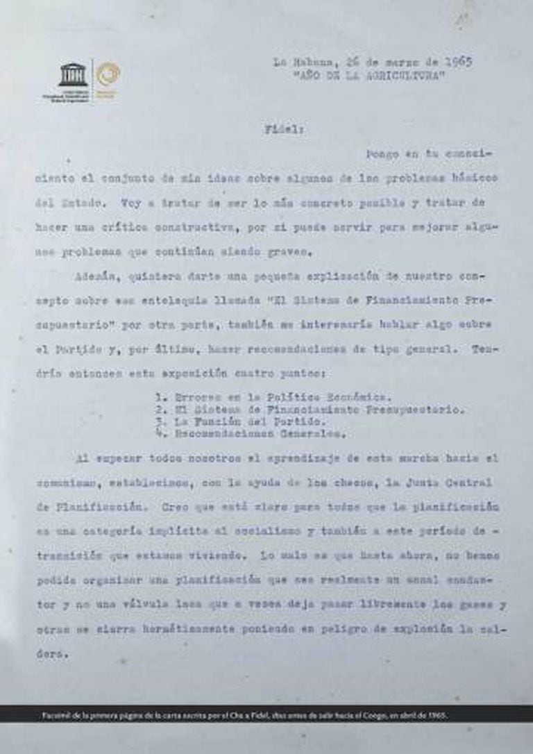 Uma das cartas, da qual até agora só se conheciam alguns fragmentos publicados como prólogo do livro Apuntes Críticos à Economia Política (2006), é sem dúvida a grande carta do Epistolario, a tal ponto que alguns especialistas na obra guevariana asseguram que marca um antes e um depois. Trata-se da segunda carta de despedida que Che escreveu a Fidel Castro antes de partir para a guerrilha no Congo. A primeira é amplamente conhecida —“Outras terras do mundo exigem o concurso de meus modestos esforços…”—, pois foi lida por Castro no dia em que foi criado o Partido Comunista de Cuba e eleito seu primeiro Comitê Central, em 3 de outubro de 1965. A segunda despedida, que agora se publica na íntegra, está datada de 26 de março desse mesmo ano e é uma análise crítica e rigorosa dos males políticos e econômicos da revolução.