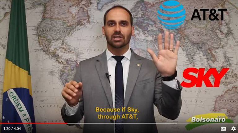 O pedido do deputado foi ignorado por enquanto. Dos cinco conselheiros, dois votaram a favor da união da AT&T com a Time Warner,. Um pediu vistas de 120 dias no processo. Os outros dois ainda não votaram. Em Brasília, Eduardo é visto como um lobista aguerrido em favor do Governo Trump, o que ele nega. Seu irmão, o senador Flávio Bolsonaro (PSL-RJ), é outro negociador junto aos congressistas na matéria. Flávio conversou com ao menos quatro dos membros da Comissão de Ciência e Tecnologia pedindo votos a favor da mudança legal.
