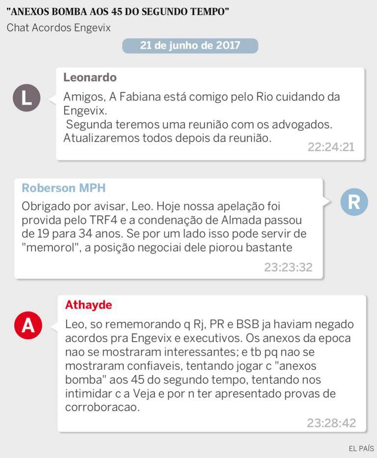 Em 21 de junho de 2017, com Temer já no poder e enfrentando problemas com Janot, o procurador Athayde Ribeiro disse nas conversas de Telegram que a menção ao então vice-presidente feita um ano antes era um “anexo-bomba”. Àquela altura, Temer já era presidente oficial desde agosto de 2016, quando o Senado confirmou o impeachment de Dilma. “Leo, so rememorando q Rj, PR e BSB ja haviam negado acordos pra Engevix e executivos. Os anexos da epoca nao se mostraram interessantes; e tb pq nao se mostraram confiaveis, tentando jogar c "anexos bomba" aos 45 do segundo tempo, tentando nos intimidar c a Veja e por n ter apresentado provas de corroboracao”, disse o procurador Athayde Ribeiro ao procurador Leonardo Cardoso de Freitas no Telegram —a grafia original usada nos chats foi preservada. A menção à Veja parece remeter, na verdade, a uma reportagem da revista Época (semanal que concorre com a Veja) que publicou em abril de 2016 as revelações que Antunes tinha em sua proposta de delação.