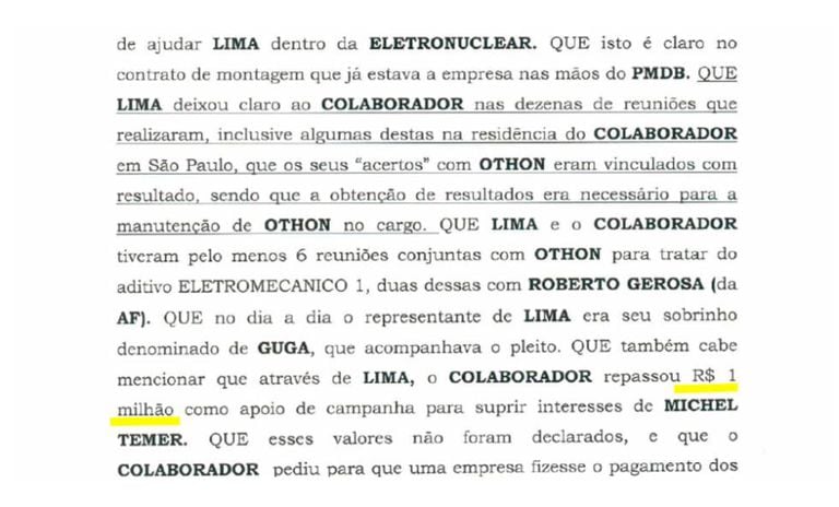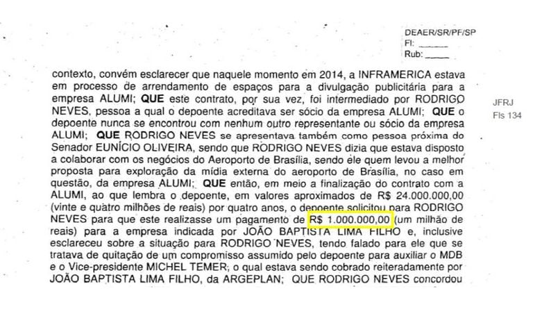 O pagamento, segundo Antunes, foi entregue a um amigo do ex-presidente, o coronel João Baptista Lima Filho, conhecido como coronel Lima. O dinheiro não saiu direto dos cofres da Engevix para Temer, mas de uma companhia prestadora de serviço do Aeroporto de Brasília, que era controlado pela Engevix. A empresa em questão era a Alúmi. O relato não convenceu os procuradores.