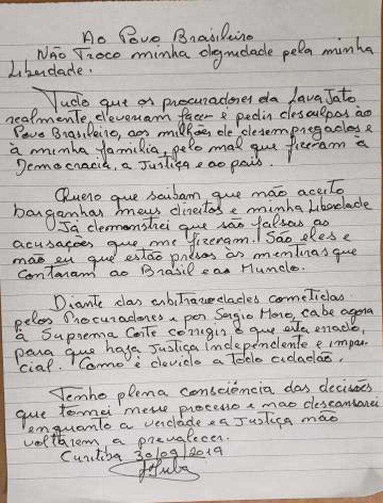 Dessa forma, a mensagem do ex-presidente é também endereçada ao Supremo Tribunal Federal (STF), e parece querer manter a pressão para que magistrados concedam os pedidos de habeas corpus feitos pela defesa, especialmente no caso que avalia a conduta do então juiz Sergio Moro, cujo julgamento foi interrompido em julho. "Diante das arbitrariedades cometidas pelos procuradores e por Sergio Moro, cabe agora à Suprema Corte corrigir o que está errado, para que haja justiça independente e imparcial. Como é devido a todo cidadão", escreveu Lula. "Tenho plena consciência das decisões que tomei nesse processo e não descansarei enquanto a verdade e a Justiça não não voltarem a prevalecer", encerra.