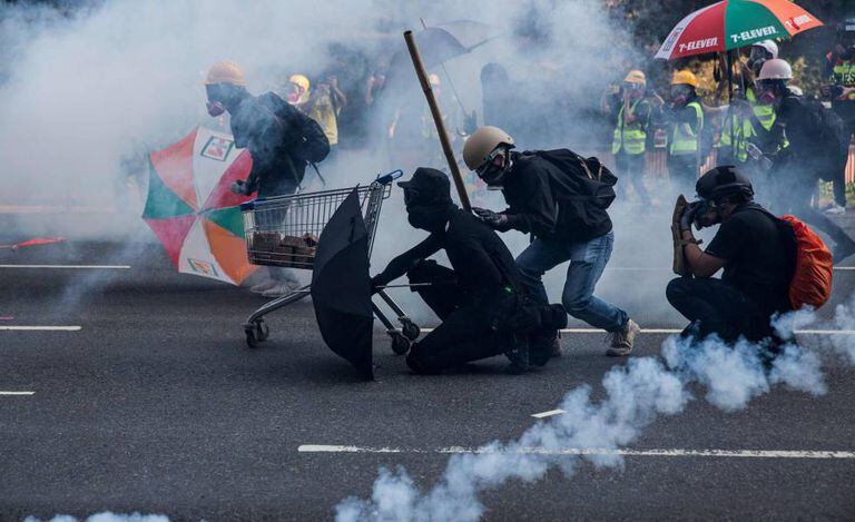 No começo da tarde tiveram início os primeiros arremessos de gás lacrimogêneo, um ingrediente já habitual a cada jornada de protestos nos confrontos entre manifestantes e Polícia em bairros mais próximos à fronteira com a China. O metrô de Hong Kong, principal meio de transporte da cidade, fechou aproximadamente um terço de suas estações, um número que foi subindo até chegar à metade do total ao longo do dia. Muitos shoppings também optaram por fechar suas portas a fim de evitar danos.