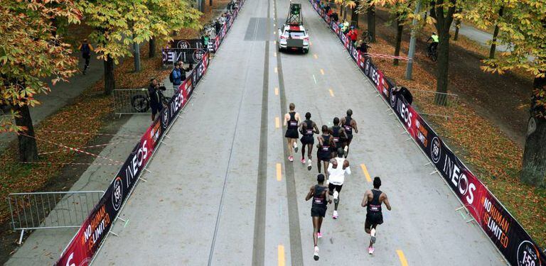 Cinco atletas em V lhe abrem caminho, levantando o vento com sua velocidade de 21,1 quilômetros por hora (correm como um relógio suíço, diz um jornalista suíço na plateia) e perseguem uma luz verde no asfalto projetada por uma van que marca o ritmo. Um raio verde que nunca alcançam e que nunca se afasta, e assim deve ser, o raio que leva aonde nenhum outro atleta chegou. Os corredores que o acompanham se alternam, entram e saem, velozes, como soldados treinados, na formação. Kipchoge permanece.
