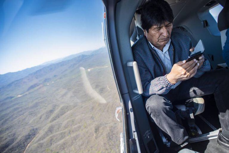 Morales viaja sozinho, sem assessores nem chefes de comunicação, mas seus passos são milimetricamente medidos. Embora a intuição também permeie tudo. Ao descer do avião em Chuquisaca, cumprimenta os chefes militares da região e se dirige em silêncio a um helicóptero, dando por certo que é preciso segui-lo. No ar se mantém em silêncio, checa seus dois celulares uma e outra vez e tenta falar com seus ministros, apesar do sinal ruim e do ruído que impede qualquer conversa. Ao descer, sempre tem uma equipe de segurança esperando com pelo menos dois veículos. Os trechos curtos pela estrada são os únicos em que ele viaja sem jornalistas.