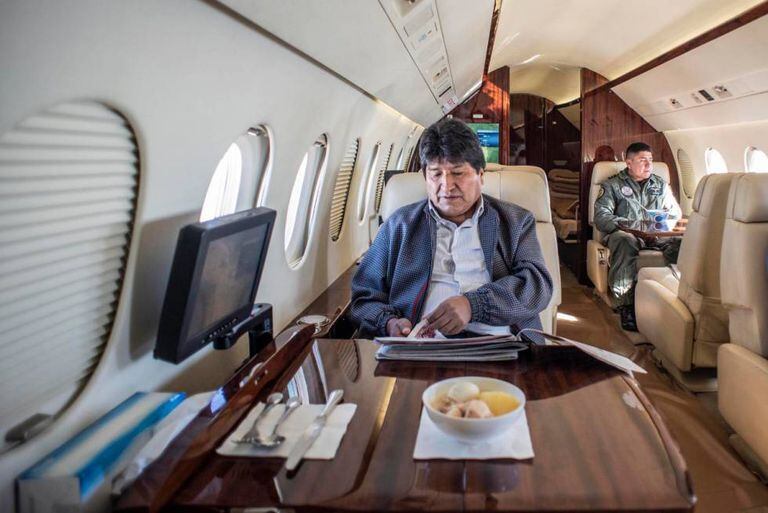 De Orujo, viaja a Cochabamba. É o deslocamento mais curto, 20 minutos, tempo suficiente para o avião decolar e pousar de novo. Já no aeroporto militar, Morales vai até uma sala e regressa quando chega a comida. São quase quatro da tarde e o tambaqui, um peixe amazônico, acompanhado de salada, arroz e mandioca frita, dura segundos no prato. Durante a refeição, só fala o bastante para terminar de organizar as reuniões com as associações, agendadas para pouco depois, e antecipa que talvez faça um pouco de exercício no final.