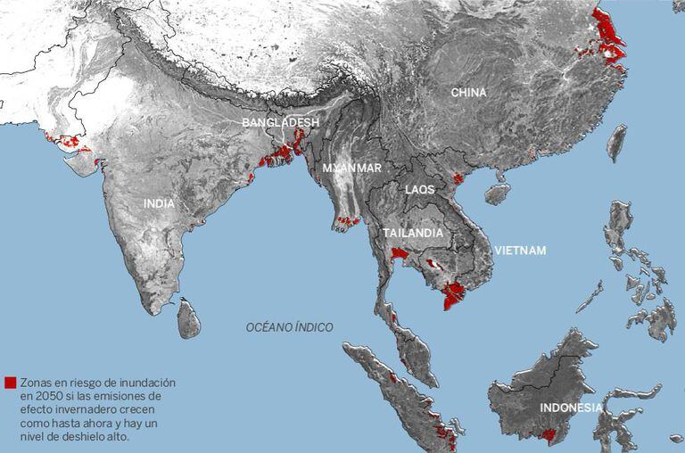 A Ásia é sem dúvida a área mais afetada em todo o planeta devido ao risco de inundações relacionadas à mudança climática. “É uma área dominada por áreas muito baixas e superpovoadas”, diz Íñigo Losada, diretor do Instituto de Hidráulica da Cantábria. O relatório publicado na terça-feira indica que a maioria das pessoas expostas reside em seis países asiáticos: China, Bangladesh, Índia, Vietnã, Indonésia e Tailândia. Dos 300 milhões que vivem em áreas de risco de inundação até 2050, aproximadamente 237 milhões residem nesses seis países. A China, com 93 milhões de pessoas agora vivendo em áreas de risco de inundação, é o país mais afetado, segundo o relatório. É seguida por Bangladesh, com 42 milhões, e Índia, com outros 36 milhões de pessoas em risco. Depois deles, Vietnã (31 milhões), Indonésia (23) e Tailândia (12).