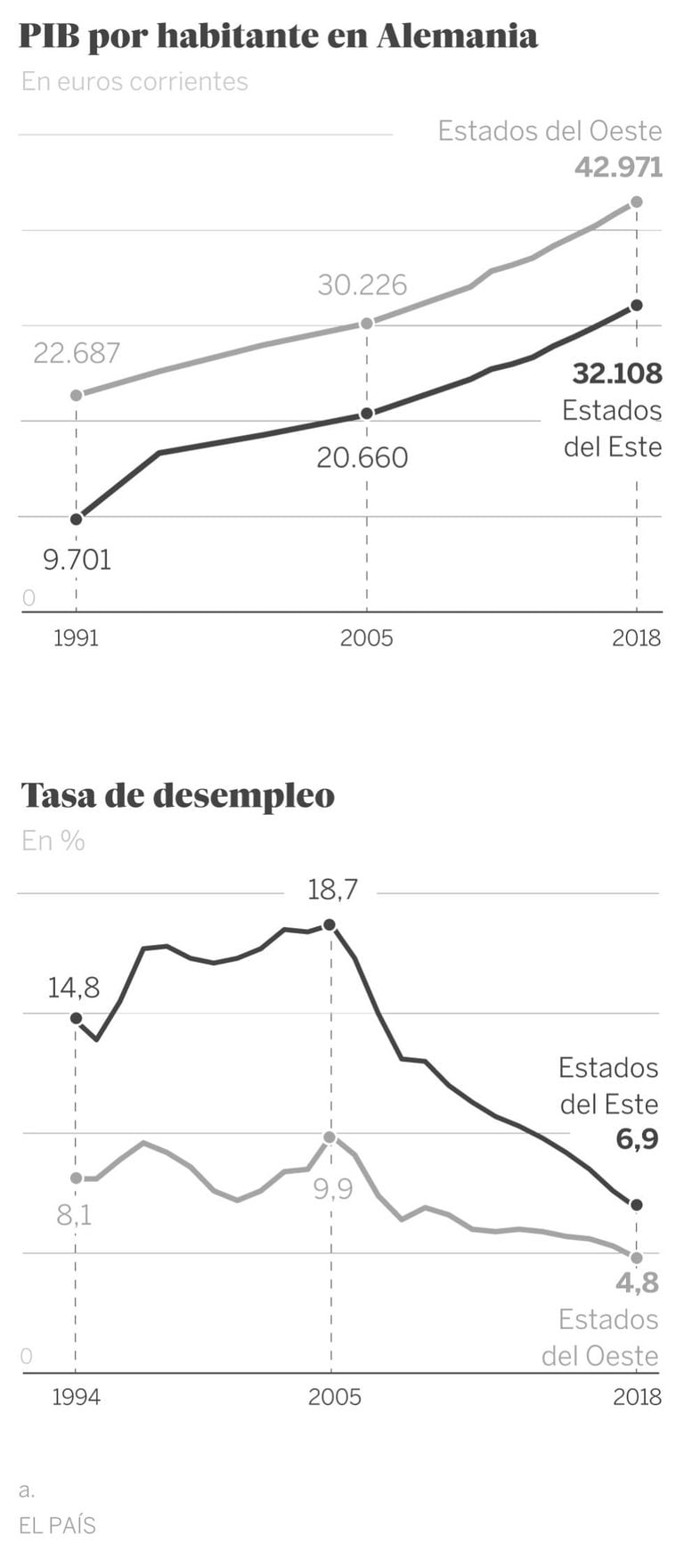 Muitos dos que agora têm 60 anos e saíram às ruas para se manifestarem pela liberdade sentiram que haviam perdido muitos anos e acreditavam que uma vida nova e muito melhor estava começando. Mas era comum eles se depararem com empregos mal remunerados, aposentadorias que não se equiparavam às do oeste e, acima de tudo, a falta de reconhecimento de suas vidas profissionais. Eles se viram diante de uma desindustrialização brutal de estruturas econômicas obsoletas, incapazes de competir no oeste do país e em um mundo global no qual o bloco do Leste Europeu deixava de existir como ator econômico e comercial. O lema era privatizar o mais rápido possível. Os empresários da Alemanha Ocidental compraram e compraram, e ainda hoje não existe uma única empresa do leste no Dax, o equivalente alemão ao Ibex. O leste continua sendo em grande medida a fábrica do país, onde se produz, mas não é o local onde as decisões são tomadas.