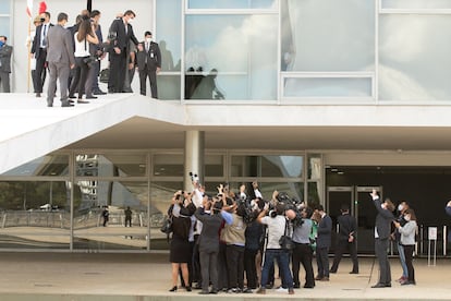 Quando essa descrição passou a circular, Bolsonaro se dirigiu à rampa do Palácio do Planalto para “tomar um ar e ver” os jornalistas, conforme relatou aos repórteres que o interrogavam. Ele queria dar a sua versão dos fatos. “Não existem as palavras superintendente ou Polícia Federal [na reunião]”, disse o presidente. E seguiu: “A Polícia Federal nunca investigou ninguém da minha família. Isso não existe no vídeo. Vocês estão sendo mal informados”. O presidente ainda disse que sempre esteve preocupado com seus familiares. “A preocupação minha, sempre foi, depois da facada, de forma bastante direcionada para a segurança minha e da minha família”.