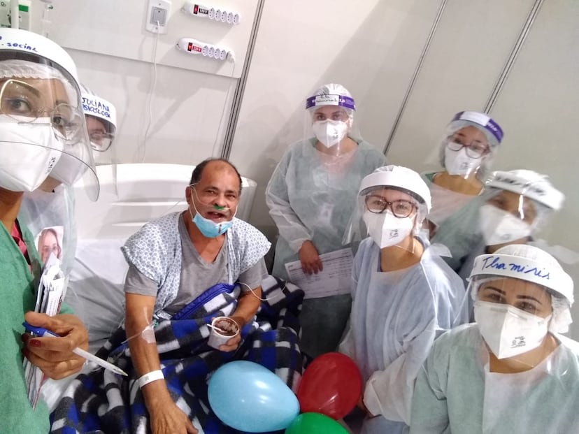 Após o trauma na entrada no SUS, foi com surpresa que os Vieiras receberam uma ligação da assistente social Adriana Pimenta, responsável pela equipe do serviço social do hospital, perguntando se poderiam fazer uma comemoração para Américo no dia 7 de maio, seu aniversário. A festa, com a participação da família pelo celular, o deixou emocionado. “Um dos nossos principais trabalhos é traçar o perfil de cada paciente, e essa atividade é feita à beira leito no hospital de campanha”, afirma Adriana. “Notamos que nossa presença no leito tem resultados positivos, pois os pacientes se sentem acolhidos e, muitas vezes, nos enxergam como uma extensão do mundo real, minimizando o motivo que os trouxe aqui”, explica a assistente social.