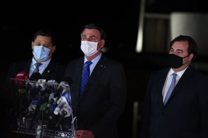 O presidente Jair Bolsonaro afirmou nesta quarta-feira que o Governo manterá o compromisso com o teto de gastos públicos ―que proíbe que as despesas cresçam em ritmo superior à inflação ― e que buscará soluções para destravar a economia brasileira. O pronunciamento acontece um dia depois de dois secretários da equipe econômica pedirem demissão e em meio a uma disputa no Congresso e dentro do próprio Executivo para driblar a regra. Uma ala do Governo defende um aumento de gastos com obras públicas e outros investimentos como forma de reaquecer a atividade econômica impactada pela pandemia do coronavírus e fortalecer Bolsonaro na disputa eleitoral de 2022. “Nós respeitamos o teto dos gastos, queremos a responsabilidade fiscal e o Brasil tem como ser um daqueles países que melhor reagirá à questão da crise”, afirmou o presidente, ao lado dos presidentes da Câmara, Rodrigo Maia, e do Senado, Davi Alcolumbre, e ministros.