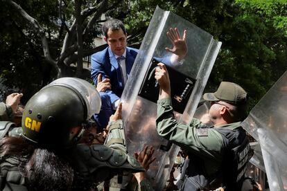Guaidó não chegou a entrar no prédio do Parlamento. Após a posse de Parra tentou entrar pulando as grades, enquanto a polícia o impedia. Antes, não entrou, segundo sua equipe, porque queria garantir que todos os dirigentes oposicionistas passassem com ele e evitar que, com a entrada somente de alguns dirigentes, a bancada chavista e os dissentes tivessem quórum suficientes para iniciar a sessão e impedir sua reeleição. “Se não entrarem todos não entra ninguém”, disse Juan Guaidó na entrada do Parlamento, em que as forças de segurança submetem à rigorosa verificação as credenciais dos parlamentares.