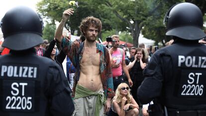 O tribunal administrativo de Berlim acabou dando razão aos organizadores, ao decidir que “a existência de um perigo imediato para a segurança pública” não era um motivo válido. No entanto, colocou como condição o respeito às medidas vigentes. Neste sábado, a Polícia, após observar como os manifestantes marchavam sem respeitar as medidas e constatar um ambiente que poderia desembocar em atos de violência, anunciou que os protestos e o ato central (previsto para ser realizado na avenida 17 de Junho) deveriam ser dissolvidos, como também ocorreu em 1º de agosto passado. O motivo? A violação das normas sobre a distância e as máscaras. “Todas as medidas tomadas até agora não levaram ao cumprimento das condições”, afirmou a Polícia através de caixas de som e pelo Twitter.