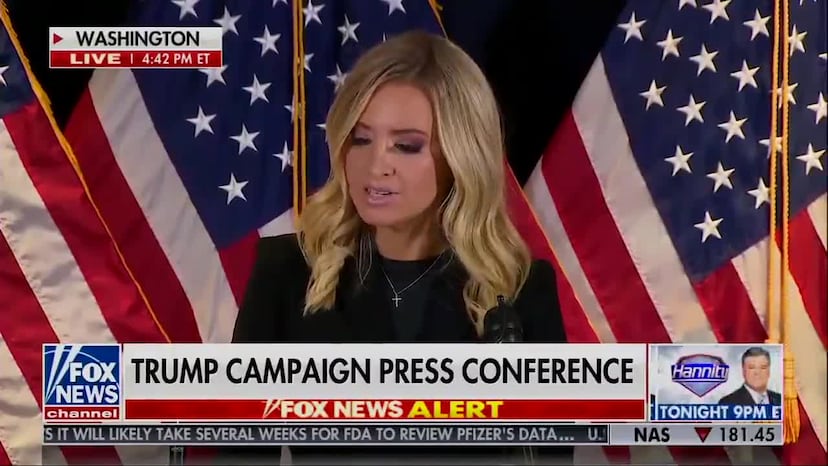 McEnany começou a coletiva afirmando que as eleições não acabaram, apesar de Biden ter superado no sábado a marca de 270 votos do Colégio Eleitoral, que lhe permite ser eleito presidente, e de seu triunfo já ter sido reconhecido pela maioria dos líderes mundiais. O contagem de cédulas legitimamente enviadas pelo correio continua em alguns Estados-chaves. Enquanto a secretária de imprensa afirmava que a Administração quer a apuração de todos os “votos legais”, e não dos “votos ilegais”, o apresentador Neil Cavuto, da Fox News, interrompeu a transmissão. “Uau, uau, uau. Acho que temos que ser muito claros: [a porta-voz] está acusando a outra parte de permitir a fraude e o voto ilegal. A menos que ela tenha mais detalhes para respaldar isso, não posso continuar mostrando isso a vocês”, afirmou Cavuto.