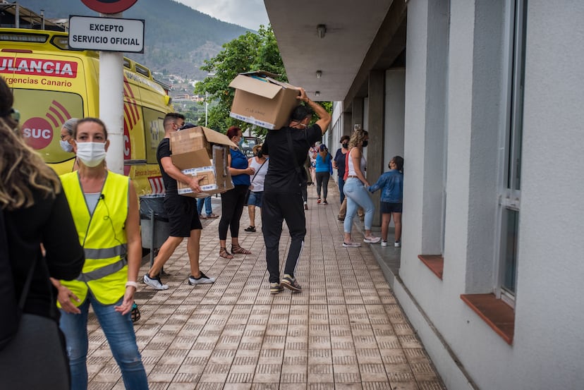 “Tem gente que chega resignada”, conta Nines, assistente social da Prefeitura de Los Llanos, no ginásio municipal que centraliza a distribuição de alimentos e roupas doados por particulares. “Mas muitos outros desmoronam e começam a chorar; são pessoas de todas as idades, que perderam tudo”, relata. Ela está encarregada de cadastrar os desabrigados e saber se conseguiram se realojar. “Ontem mesmo”, relata Fátima, funcionária do Serviço Canário de Urgências, “tivemos que atender uma angina de peito de uma mulher que precisou pedir socorro”.
