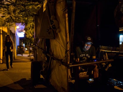 Carroceiro armou uma casa na calçada e combate a solidão com sua cachorra e acesso à internet
