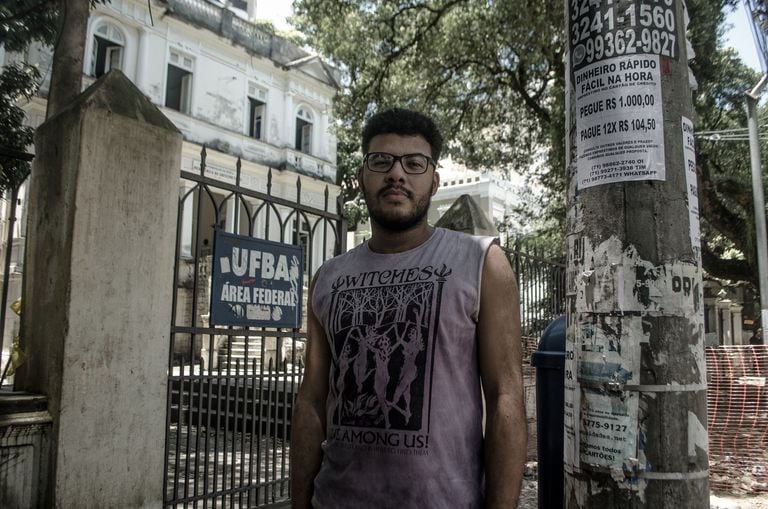 Meu nome é Gustavo Domingues de Oliveira, tenho 27 anos, e sou cotista. Curso o 7º semestre de fisioterapia na Universidade Federal da Bahia (UFBA) e moro com outros 36 estudantes, quase todos negros, em uma residência universitária no Corredor da Vitória, um dos metros quadrados mais caros de Salvador. Nasci no Grajaú, extremo sul de São Paulo, de mãe paulistana, negra, dona de casa. Meu pai é baiano, branco e trabalha como vigilante. Sou o caçula de três irmãos, um negro, mais velho, e uma irmã de pele clara e cabelo bem liso. Sempre me vi como uma pessoa mestiça até eu entender o sentido político de ser negro. Isso aconteceu aos 17 anos, quando entrei na faculdade de jornalismo, curso do qual desisti. Estava repetindo uma matéria e a professora perguntou se eu me sentia deslocado, como cotista. Com esse questionamento me percebi negro. Percebi que as pessoas que se pareciam comigo na universidade não eram outros estudantes. Sei que o questionamento dela foi para me incentivar, porque percebia que eu me sentia atrasado em relação aos colegas. Mas foi ali eu entendi que minha cor, meu cabelo, minhas roupas falavam antes de mim e que isso me definiria na sociedade. Assim foram os meus dias: